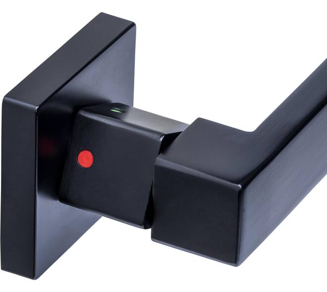 Het blokkeermechanisme is geïntegreerd in de kruk en eenvoudig te bedienen met een draaiknop. Door de knop op rood te draaien, wordt de deur geblokkeerd en kan deze niet worden geopend. Hierdoor zijn geen extra sleutels, cilinders of toiletgarnituren nodig.
